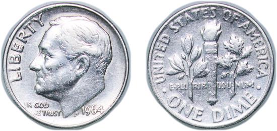 United States Federal republic 1964 1 Dime "Roosevelt Silver Dime" Silver (.900) United States Mint of Philadelphia (929360000) 2.51g XF KM 195 Schön 197