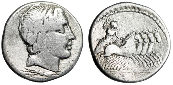 Gargilius, Ogulnius, and Vergilius AR Denarius Rome Mint 86 BC Obverse: Laureate head of Apollo right; thunderbolt below Reverse: Jupiter, hurling thunderbolt and holding reins, driving galloping quadriga right References: Crawford 350A/2; Sydenham 723; RSC 226; RBW 1333 Size: 18mm, 3.77g Professional Numismatic Notes: Fine overall; well-struck and attractive!
