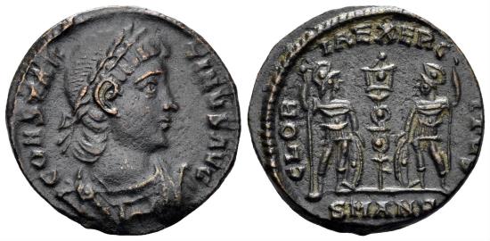 Constantinus II. 337-341 AD. AE Follis (1.59g, 15mm). Antioch mint. Struck 337-341 AD. Obv.: CONSTANTINVS AVG, laureate, draped, and cuirassed bust right. Rev.: GLORIA EXERCITVS, two soldiers holding spears and shields with one standard between them, o on banner; SMANS in exergue. LRBC 175. gVF. |