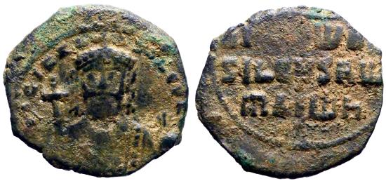 Obv: RωmAn' bASILεωS Rωm. Facing bust of Romanus, holding transverse labarum and globus cruciger