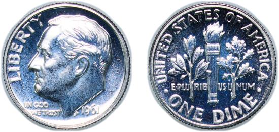 United States Federal republic 1961 1 Dime "Roosevelt Silver Dime" Silver (.900) United States Mint of Philadelphia (3028244) 2.52g PF KM 195 Schön 197