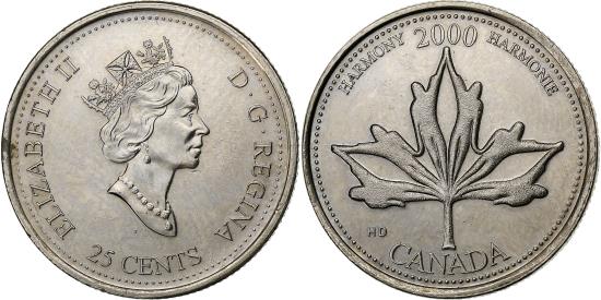 | | Canada, Elizabeth II, 25 Cents, 2000, Royal Canadian Mint, Nickel, | | | Crowned, Maple leaf, date above | | FEATURES |