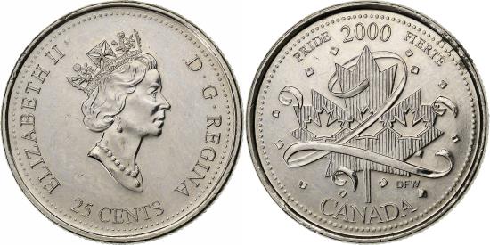 | | Canada, Elizabeth II, 25 Cents, 2000, Royal Canadian Mint, Nickel, | | | Crowned head right, denomination below, Large ribbon 2 with three small maple leaves on large maple leaf, date above | | FEATURES |