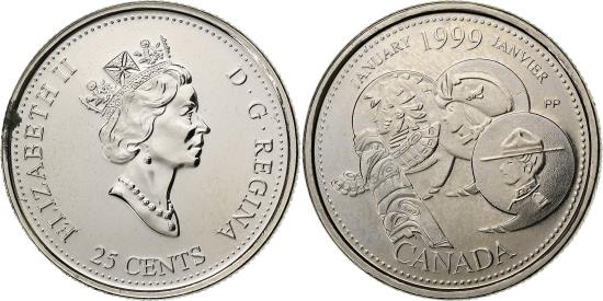 | | Canada, Elizabeth II, 25 Cents, 1999, Royal Canadian Mint, Nickel, | | | Crowned head right, Totem pole, portraits | | FEATURES |