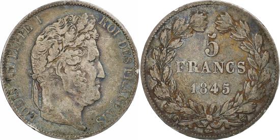 | | France, 5 Francs, Louis-Philippe, 1845, Lille, Silver, , Gadoury:678a | | | Louis-Philippe, Laureate head right, Mint marks at edge outside wreath | | FEATURES |