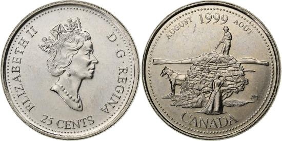 | | Canada, Elizabeth II, 25 Cents, 1999, Royal Canadian Mint, Nickel, | | | Crowned head right, Hay harvesting | | FEATURES |