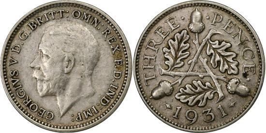 | | Great Britain, George V, 3 Pence, 1931, Silver, , KM:831 | | | Head left, Three oak leaves and acorns divided, Bertram MacKennal | | FEATURES |