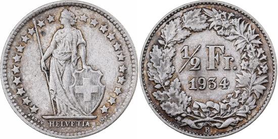 | | Switzerland, 1/2 Franc, 1934, Bern, Silver, , KM:23 | | | Standing Helvetia with lance and shield within star border, Value, date within wreath, HELVETIA, 1/2 Fr. // 1934 // B | | FEATURES |