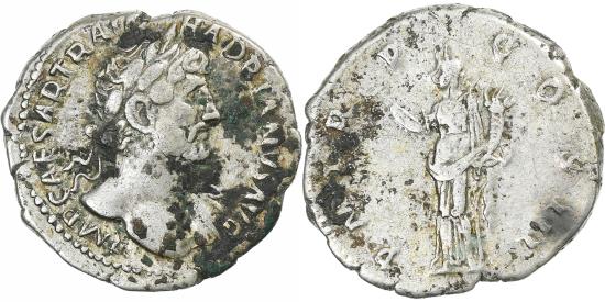 | | Hadrian, Denarius, 119-120, Rome, Silver, , RIC:221 | | | Bust of Hadrian, laureate, bare chest, traces of drapery on far shoulder, right., Felicitas, standing left, holding caduceus and cornucopia., IMP CAESAR TRAIAN HADRIANVS AVG, P M TR P COS III | | FEATURES |