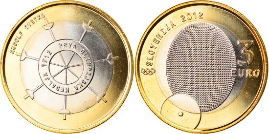 | | Slovenia, 3 Euro, 1er médaillé olympique, 2012, , Bi-Metallic, KM:109 | | | Stylized fencing, 7 fencing swords pointed downward | | FEATURES |