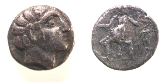 Southeast Arabia. Macai. 2nd century BC. AR obol (11mm, 0.97g). Imitating the types and legends of Alexander the Great (336-323 BC). Male head r. / Zeus seated l. on throne, holding eagle and scepter. Cf. Arnold-Biucchi, Arabian 12.