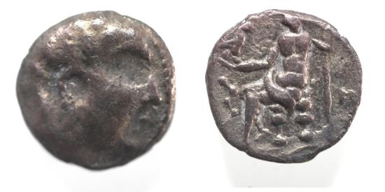 Southeast Arabia. Macai. 2nd century BC. AR obol (11mm, 1.09g). Imitating the types and legends of Alexander the Great (336-323 BC). Male head r. / Zeus seated l. on throne, holding eagle and scepter; to l., crude South Arabian letter shin. Cf. Arnold-Biucchi, Arabian 12.