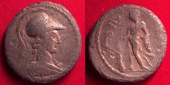 | C VIBIUS VARUS AR silver denarius. Rome, 42 BC. Helmeted bust of Minerva right, wearing aegis. Rev. Hercules standing l., holding club and lion's-skin; in right field, C VIBIVS; on left, VARVS. Babelon Vibia 26. Sydenham 1140. Sear Imperators 194, RBW 1741, Crawford 494/38. Rare. 17mm, 3.7g. |