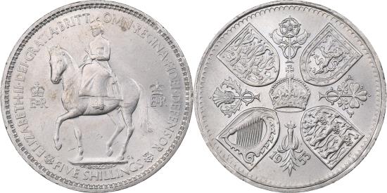 | | Great Britain, Elizabeth II, Crown, 1953, Copper-nickel, , KM:894 | | | Queen on horseback left, crowned monograms flank, Crown at center of cross formed by rose, shamrock, leek and thistle, shields in angles, Gilbert Ledward | | FEATURES |