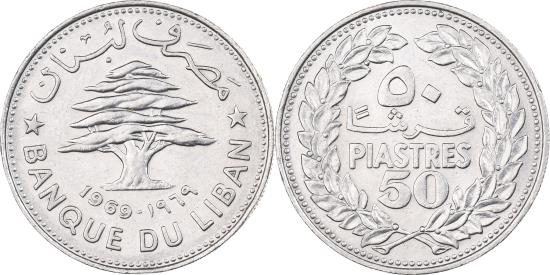 | | Lebanon, 50 Piastres, 1969, Nickel, , KM:28.1 | | | Cedar tree above dates, Value within wreath | | FEATURES |