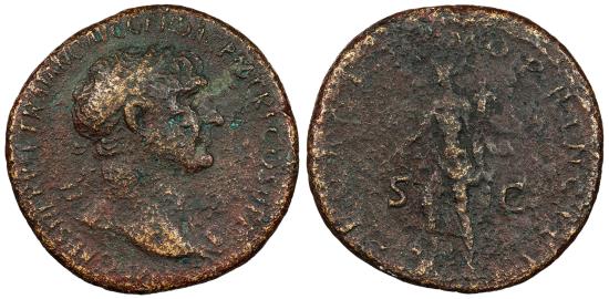 AE Sestertius 23.67g. 33mm. 104-107 A.D. Rome Mint Laureate bust r., drapery on far shoulder. IMP CAES NERVAE TRAIANO AVG GER DAC P M TR P COS V P P Pax standing l., holding branch and cornucopiae, foot on bust of captured Dacian to l.; S-C to either side. S P Q R OPTIMO PRINCIPI RIC II 503 Red-brown patina. Moderate porosity and roughness.