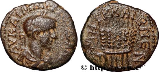GORDIAN III Augustus Triassaria 244 Césarée, Cappadoce R1 copper Obverse : Buste lauré, drapé et cuirassé, de Gordien III à droite, vu de trois quarts en arrière (A*2) Reverse : Gerbe liée de six épis Commentary : Monnaie centrée. Usure importante mais régulière. Revers agréable. Patine foncée