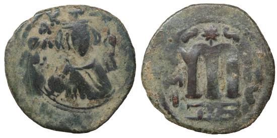 | Umayyads Abd al-Malik (685-705), Arab-Byzantine imitation, 685-690, AE Fals, Hims (Emesa) mint. 22mm 4.63g. Obverse: crowned imperial bust facing, holding globus cruciger, KAΛON to left. Reverse: large M, EMI to left, CHC to right. SICA I 539-42var. Vf+ |