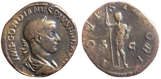 GORDIAN III. 238-244 AD. Æ Sestertius (16.65 gm). Struck 241-243 AD. IMP GORDIANVS PIVS FEL AVG, laureate, draped, and cuirassed bust right, seen from behind / IOVI STATORI, S C across field, Jupiter standing front, head right, holding sceptre in right hand, cradling thunderbolt in left arm. RIC IV 298a; Banti 37; Hunter 134; Cohen 111. |