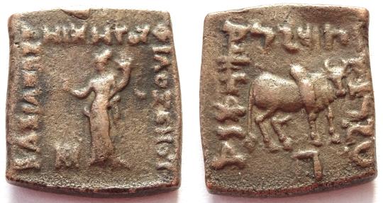 Indo-Greeks Philoxenos Aniketos (ruled c. 125-110 BC) AE coin (7.31 g) Obverse: Female deity standing left, making benediction gesture and holding cornucopia; Greek legend around Reverse: Zebu bull standing right; Kharoshthi legend around Maharajasa apaihatasa Philasinasa (of Great King Philoxenos the Unconquered) Ref: HGC 12, 274; Bopearachchi 10F An attractive specimen with clear details. CHOICE. |