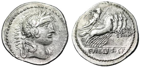 C VIBIUS CF PANSA CONTEMPORARY IMITATION DENARIUS Rome Mint 90 BC Obverse: PANSA Laureate head of Apollo right; III below chin Reverse: Minerva driving galloping quadriga right, holding trophy, reins, and spear; C VIBIVS C F in exergue References: Crawford 342/5b cf; Sydenham 684a cf Size: 20mm, 3.03g Professional Numismatic Notes: Good very-fine and a very well done imitative!