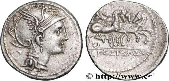 T. (MAL). AP. CL. Q. (VR) Victoria (la Victoire) dans un trige au pas à droite tenant les rênes des deux mains ; au-dessus du trige, un symbole