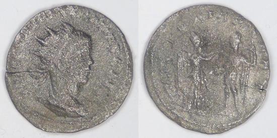 Rev: Victory standing right, holding palm and presenting wreath to Valerian II in military attire, standing left, holding globe and resting on spear, with the legend VICTORIA PART
