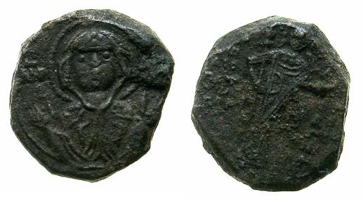BYZANTINE EMPIRE.John II Comnenus AD 1118-1143.AE.Tetarteron.Mint of CONSTANTINOPLE. ( 4.68g, 19.1mm, 6h ) MP-(ΘΥ), facing bust of The Theotokos orans. Reverse.Emperor standing holding jewed sceptre in right hand and globus cruciger in left. Ref:Sear 1946. Good very fine / very fine, obverse deposit to right of head, reverse surface porosity. Attractive depiction of The Theotokos. |
