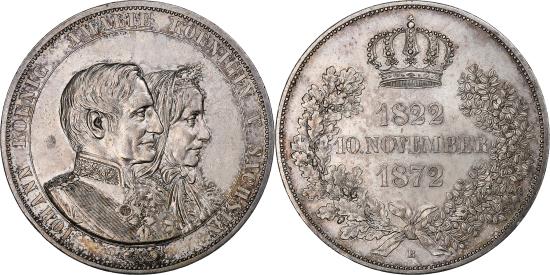 | | Kingdom of Saxony, Johann, 2 Thaler, 1872, Dresden, Silver, | | | Bust of the royal couple on the right (Johann and Amalie of Saxony)., Crown above the anniversary dates. All within a wreath., Dav GT III# 899 | | FEATURES |