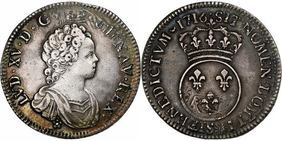 | | France, Louis XV, 1/4 Ecu Vertugadin, 1716, Bourges, réformé, Silver | | | Draped and cuirassed bust of Louis XV, bareheaded, on the right., Crowned round shield of France., LVD•XV•D•G•FR•ET•NAV•REX, SIT•NOMEN•DOMINI•A•BENEDICTVM / 1716 | | FEATURES |