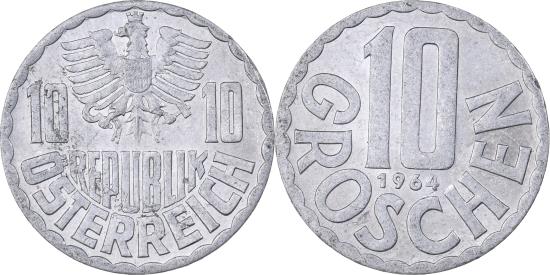 | | Austria, 10 Groschen, 1964, Vienna, Aluminum, , KM:2878 | | | Small Imperial Eagle with Austrian shield on breast, at top between numbers, scalloped rim, stylized inscription below, Large value above date, scalloped rim | | FEATURES |