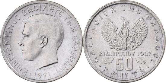 | | Greece, Constantine II, 50 Lepta, 1971, Copper-nickel, , KM:97.1 | | | Small head left, Soldier in front of Phoenix | | FEATURES |