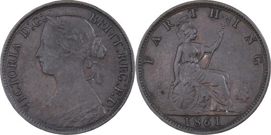 | | Great Britain, Victoria, Farthing, 1861, Bronze, , KM:747.2 | | | Draped bust left, Britannia seated right, Toothed border., VICTORIA D:G: BRIT: REG: F:D: | | FEATURES |
