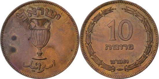 | | Israel, 10 Pruta, 5709 (1949), Bronze, , KM:11 | | | Amphora and country name in Hebrew and Arabic, Value within wreath and date in Hebrew | | FEATURES |
