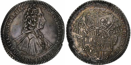 | | Bishopric of Olomouc, Wolfgang von Schrattenbach, Thaler, 1725, Kroměříž | | | Portrait in cardinal robes of Wolfgang von Schrattenbach on the right., Oval shield within a baroque cartouche surmounted by a crown and a mitre., A superb specimen on a wide flan, having been lightly cleaned in the past but covered with a beautiful patina of a deep, uniform grey, with iridescent tones, particularly in the legends. | | FEATURES |