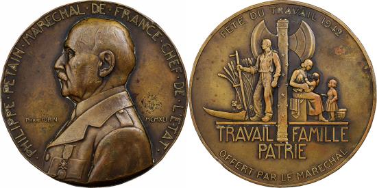| | France, Medal, Fête du Travail, 1942, Bronze, Turin, | | | Bust of Marechal wearing a medal, left; date on right., Double-bladed axe decorated with stars separating on the left a man holding a scythe, wheat and flowers behind him, and on the right a seated woman and two children; motto below., Medal showing traces of molding in the hollows and several marks on the edge., ·PHILIPPE·PETAIN·MARECHAL·DE·FRANCE·CHEF·DE·L'ETAT· / MCMXLI, FETE DU TRAVAIL 1942 / TRAVAIL FAMILLE PATRIE / OFFERT PAR LE MARÉCHAL | | FEATURES |