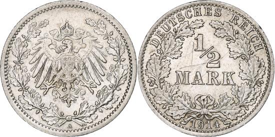 | | GERMANY - EMPIRE, 1/2 Mark, 1914, Berlin, , Silver, KM:17 | | | Denomination within wreath, Crowned imperial eagle with shield on breast within wreath, Some coins dated from 1918-19 were issued with a black finish to prevent hoarding. | | FEATURES |