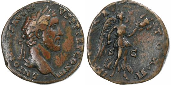 | | Antoninus Pius, Sestertius, 143-144, Rome, Bronze, , RIC:717a | | | Head of Antoninus Pius, laureate, right, Victory, winged, draped, flying right, holding trophy, pointing upwards to right, in both hands, RIC III Antoninus Pius 717A, ANTONINVS AVG PIVS P P TR P COS III, IMPERATOR II / S C | | FEATURES |