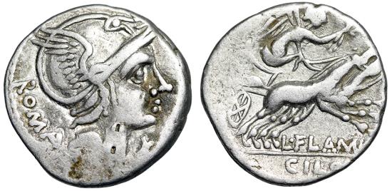 L. Flaminius Chilo AR Denarius Rome Mint 109-108 BC Obverse: Helmeted head of Roma right; ROMA behind, X (Denominational mark) below chin Reverse: L FLAMINI/CHILO in two lines below and in exergue, Victory, holding wreath and reins, driving galloping biga right References: Crawford 302/1; Sydenham 540; Flaminia 1 Size: 19mm, 3.80g Professional Numismatic Notes: Very-fine!