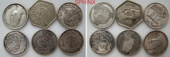 289CG5R) Egypt, British occupation , Group of 6 coins 2 piasters AR silver : Each coin weights 2.8 grms 0.833 silver content; 2 Farouk, 2 Fu'ad, 2 Sultan Hussein; ALL different dates; grade average VF or better;