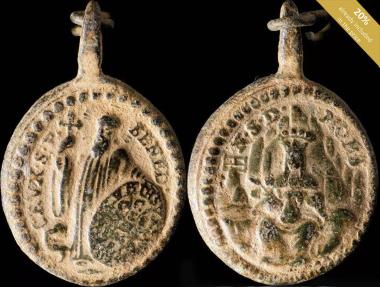 Reverse: The saint with a radiant halo, half-length, turned to the left. He wears a Benedictine cowl and holds the book of rules in his left hand and a raised cross in his right. At his feet, on the left, is the shield-cross of Saint Benedict, and on the right, a raven with bread in its beak.