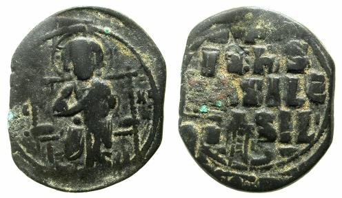 BYZANTINE EMPIRE.Anonymous.AE.Follis.Class D Mint of CONSTANTINOPLE. ( 8.42g, 30mm, 6h ) Nimbate seated figure of Christ facing; holding book of gosples, in outer field IC-XC. Reverse.legend in three lines: -+- / IS XC / BASILE / BASIL / -∪- " Jesus Christ, King of Kings "