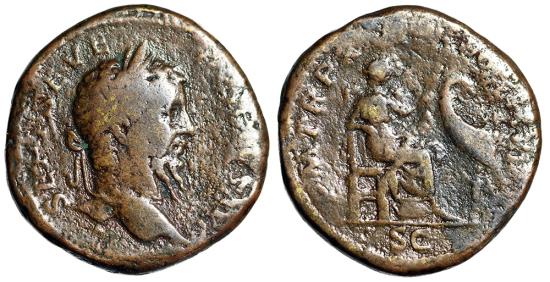 Septimius Severus Sestertius Rome Mint 210 AD Obverse: L SEPT SEVERVS PIVS AVG Head of Septimius Severus, laureate, right Reverse: P M TR P XVIII COS III P P S C Annona, draped, seated right, holding corn-ears in lap, before her, prow of ship with small figures References: RIC 794a Size: 32mm, 25.63g Professional Numismatic Notes: Fine; a scarce type!