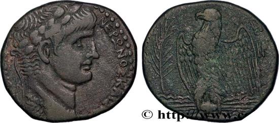 NERO Augustus Bronze 61-62 Antioche, Syrie, Séleucie et Piérie bronze Obverse : Buste lauré de Néron jeune à droite avec légide sur le cou (O*4) Reverse : Aigle debout à gauche sur un foudre ailé, les ailes déployées ; dans le champ à gauche, une palme verticale Commentary : Monnaie centrée. Joli buste de Néron. Revers agréable. Patine foncée