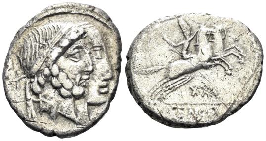 C. Marcius Censorinus. 88 BC. AR Denarius (3.66g, 18mm). Rome mint. Obv.: jugate heads right of Numa Pompilius, bearded, and Ancus Marcius, beardless, to right. Rev.: Desultor, wearing conical cap and holding whip; XXI below horses, C•CEN[SO] in exergue. Crawford 346/1d; RSC Marcia 18. Few scratches, VF. |