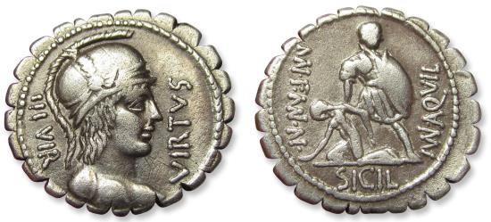 MN•AQVIL MN F MN N, warrior standing facing, head right, holding shield and raising slumped figure of Sicilia with right arm, SICIL in exergue