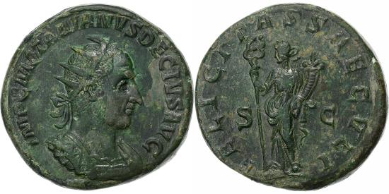 | | Trajan Decius, Double Sestertius, 249-251, Rome, Bronze, , RIC:115a | | | Bust of Trajan Decius, radiate, cuirassed, right, Felicitas, draped, standing left, holding long caduceus in right hand, and cornucopiae in left hand, Remarkable double sestertius. With excellent preservation of the engravings (although the hair may have been slightly re-engraved), this massive bronze coin has been very well struck, the flan is round and wide, making it extremely interesting and attractive. The portrait of Trajan Decius, an emperor in the early years of the crisis that hit the Roman Empire during the 3rd century, is remarkable, and it is rare to find this level of preservation of the details on these bronze coins intended for regular and frequent exchanges. RIC IV Trajan Decius 115A., IMP C M Q TRAIANVS DECIVS AVG, FELICITAS SAECVLI / S C | | FEATURES |