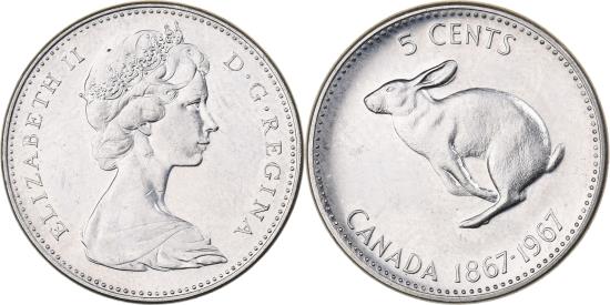 | | Canada, Elizabeth II, 5 Cents, 1867-1967, Royal Canadian Mint, Nickel | | | Queen's bust right, Snowshoe rabbit bounding left divides dates and denomination, Arnold Machin | | FEATURES |