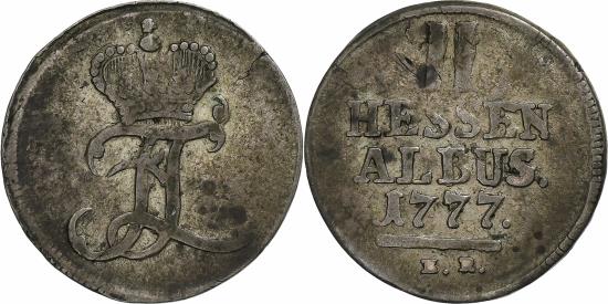 | | German States, HESSE-CASSEL, Friedrich II, 2 Albus, 1777, Billon, | | | Crowned monogram, Value, date, II/HESSEN/ALBUS/date, Counterfeits exist within dates 1771-72, 84 and 85. | | FEATURES |