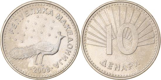 | | Macedonia, 10 Denari, 2008, Copper-Nickel-Zinc, , KM:31 | | | Peacock, Value within rays | | FEATURES |